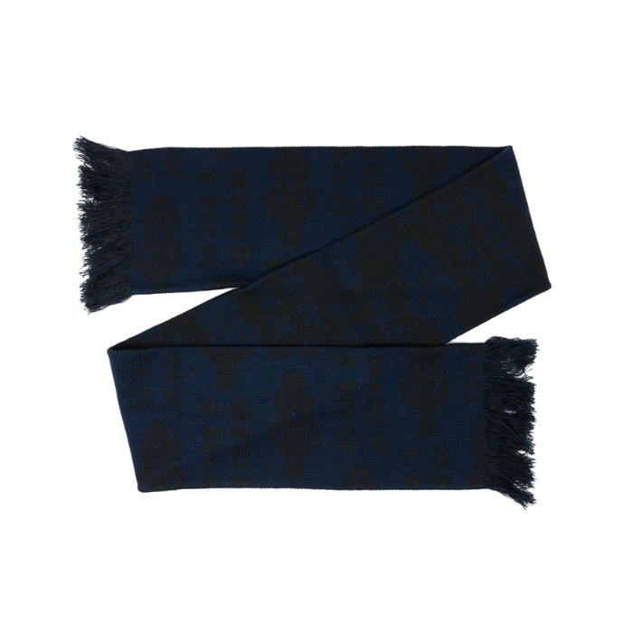L’écharpe chic et discrète au premier abord de part ce tricotage ton sur ton, noir et marine, mais bien puissante une fois qu’on y découvre cet allover, répétition de la typographie « Mourir à Brest » et de l’ancien logo de BMO. Une belle étiquette tissée vient finaliser la pièce.