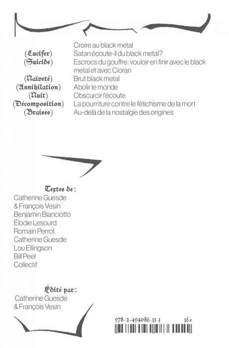 Qui a encore peur du black metal ? Pendant que Kanye West récupère l’esthétique de Burzum pour son merch, Varg Vikernes fait des vidéos complotistes dans son van. Alors qu’il a été le genre-repoussoir par excellence, il apparaît aujourd’hui édulcoré, grandiloquent ou problématique. Continuer à porter le genre, en lui insufflant un vent transgressif nouveau, est alors un acte de foi. Sans fausse pudeur sur les obsessions fondamentales du genre (satanisme, suicide, destruction, etc.), ce recueil puise dans les forces levées par des groupes comme Mayhem, Darkthrone et leurs disciples pour proposer une vision critique de ce que signifie croire au black metal aujourd’hui.