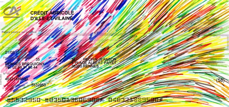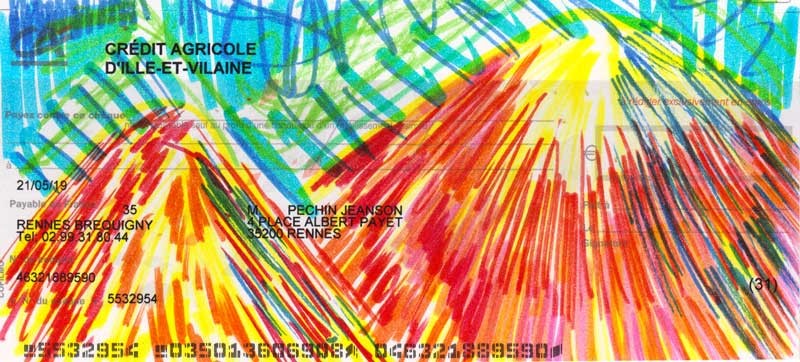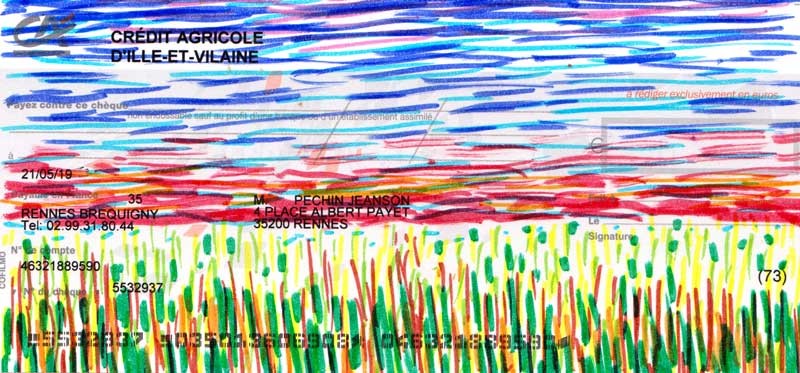 Comme beaucoup, Jeanson Péchin n'a pas vraiment d'argent. On va dire que ses revenus ressemblent à la lame d’une scie égoïne bien émoussée. Alors pour toucher du bout des doigts un monde où pratique artistique et revenu décent vont de paire, Péchin réalise des dessins dans son carnet de chèques.
