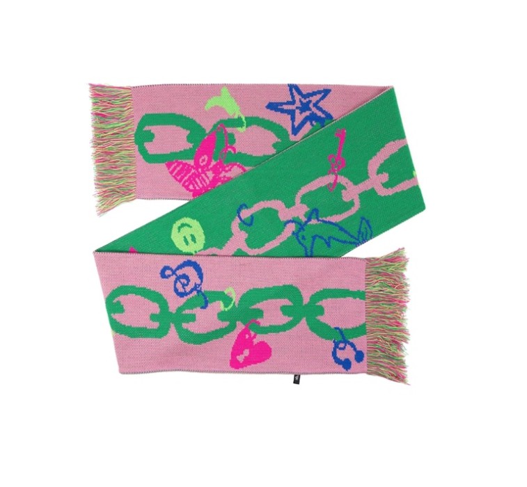 Une chaîne tricotée comme un collier fétiche, voilà l’intention forte de l’artiste Delphine Dénéréaz. Dessus pendent des breloques qui claquent, des port-bonheurs qui brillent – cœur/clef/dauphin transforment l’écharpe en bijoux.
