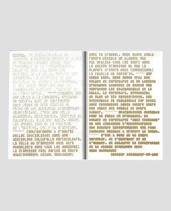 Spécimen Typographique du Studio Baldinger Vu-Huu, mise en page de leur caractère 'Dina' créé en 2023. Dina est un caractère conçu pour la nouvelle identité de la ville de Chaumont. Toute la famille de police est disponible gratuitement chez BVH Type.