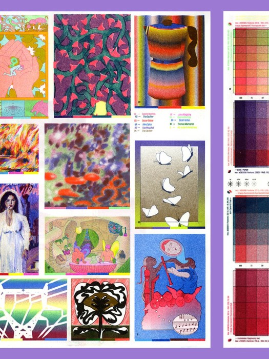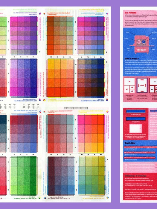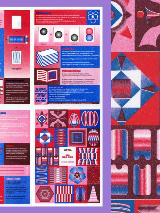 Un guide sur l’impression en risographie par Oscar Ginter. Deux feuilles A3 imprimées avec 67 passages de couleurs présentant les possibilités de la technique d’impression et de l’atelier Quintal.