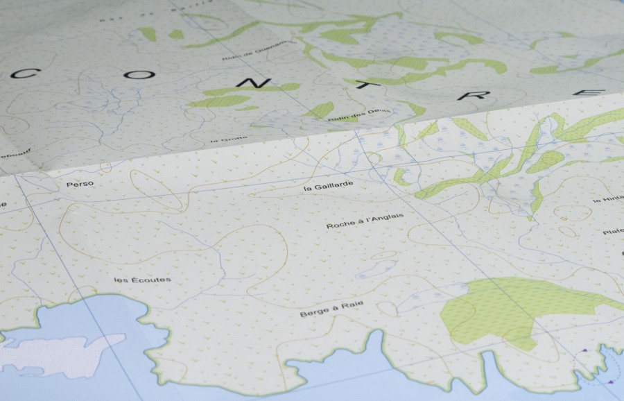 Cette cartographie est le premier point d’ancrage de l’exploration de l’île de la Contre Terre. S’il a semblé important de commencer par une production d’ordre cartographique, c’est en raison de la dimension créative des cartes, la manière qu’elles ont de pouvoir installer les conditions de visibilité d’un espace géographique. Toutes les données qui figurent sur cette carte sont vraies, aussi vraies du moins qu’une carte puisse être considérée comme vraie.
