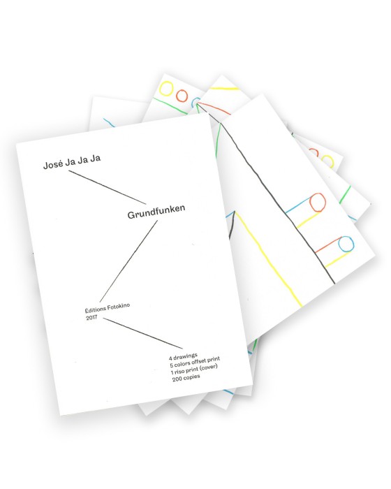 Publié à l’occasion de l’exposition « ink #2 » au Studio Fotokino en 2017. Portfolio de quatre dessins de José Ja Ja Ja (José Quintanar), issus de sa série Grundfunken. Quatre tirages limités, encartés dans une couverture monochrome imprimée en Riso. À garder comme un livre, ou à accrocher à ses murs !