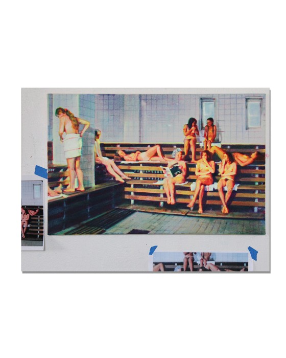 Sauna is a silkscreen print made from a photograph of Nina Childress' studio. This image was taken frontally and incorporates the painting Sauna as well as two photographs taped to the wall and used by the artist for the production of the canvas. The Sauna silkscreen print proposes a kind of image within an image; it does not propose the reproduction of an existing work but rather a kind of extension, with the studio, the artist's way of working and the finished work. Presumably intended to be presented on a wall, this silkscreen print plays on this representation and on the wall hanging technique generally used for works of art.