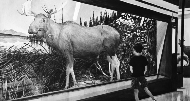 Anthropo_Scènes / Réflexions sur la représentation de la nature et du paysage tandis que l’effondrement des espèces et de la biodiversité à l’échelle planétaire est une réalité concrète. Le concept anthropocentré de nature devient exogène et mortifère. Les paysages peints, les scènes factices, les animaux en taxidermie… L’illusion du vivant est un spectacle. Hors du monde, démiurges autoproclamés et destructeurs, nous ne pouvons qu’être spectateurs impuissants de notre incapacité à nous penser comme faisant partie de l’ensemble des vivants. La peinture interroge notre rapport à l’image, notre regard sur le monde vivant et notre place.