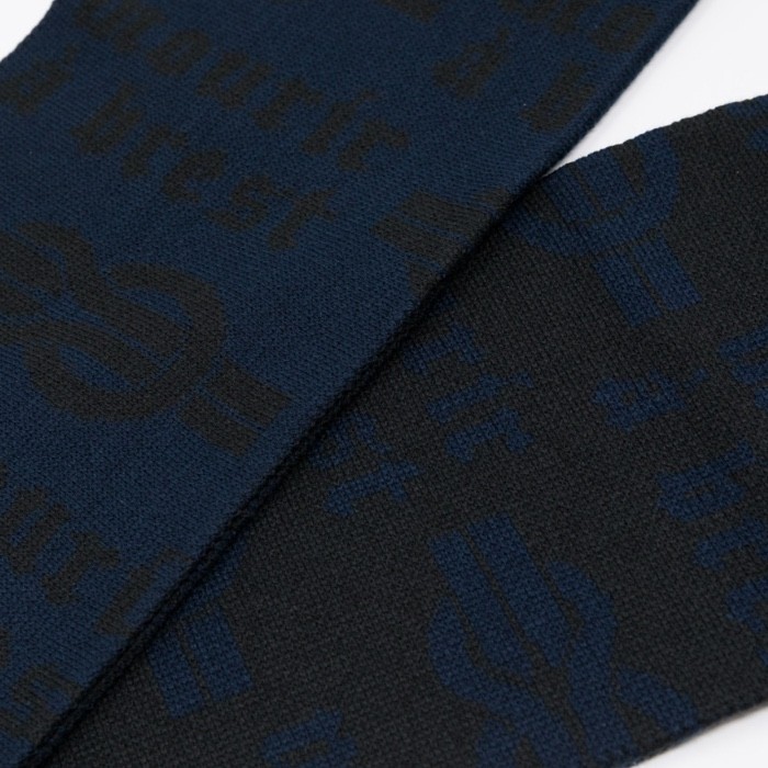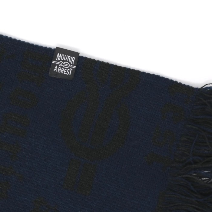 L’écharpe chic et discrète au premier abord de part ce tricotage ton sur ton, noir et marine, mais bien puissante une fois qu’on y découvre cet allover, répétition de la typographie « Mourir à Brest » et de l’ancien logo de BMO. Une belle étiquette tissée vient finaliser la pièce.