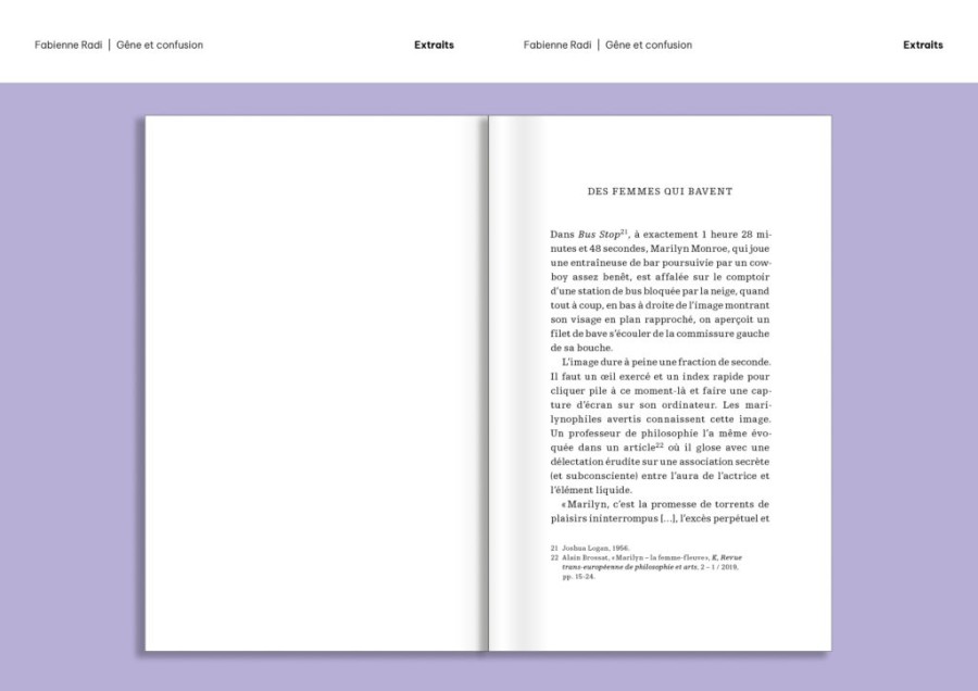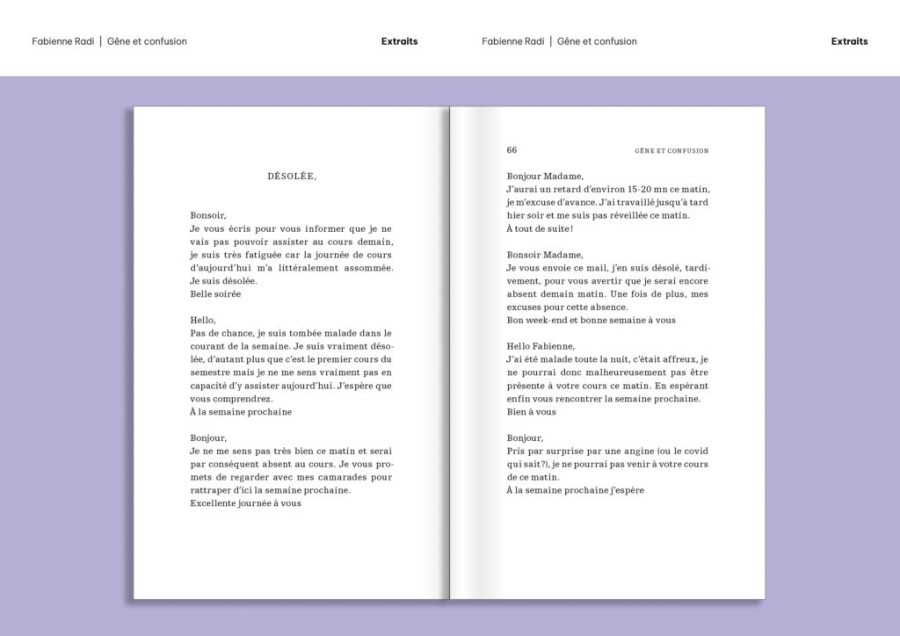 Un homme envoie ses condoléances par erreur depuis la Sibérie; un père offre une taupe morte à sa fille; un avocat essaie de cacher sa langue poilue; une mère de famille est obsédée par une tache qui ne part pas; une jeune femme se méprend sur les paroles de sa prof de yoga; une tante essaie de récupérer un tableau attribué à son neveu; un jogger excentrique ment à ses ami·e·s… Les protagonistes de Gêne et confusion se retrouvent dans l’embarras, tentent de gérer des quiproquos, essaient de dissiper des malentendus, traversent parfois des moments de honte. Fabienne Radi débusque le comique derrière la confusion et pointe le potentiel créatif que la gêne peut susciter en nous. Son livre se construit comme un montage, mélangeant les genres et les formats: fiction, témoignage, lettre, commentaire, liste, citation – quand la littérature fait feu de tout bois !