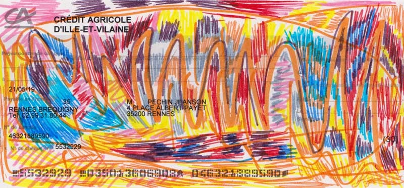 Comme beaucoup, Jeanson Péchin n'a pas vraiment d'argent. On va dire que ses revenus ressemblent à la lame d’une scie égoïne bien émoussée. Alors pour toucher du bout des doigts un monde où pratique artistique et revenu décent vont de paire, Péchin réalise des dessins dans son carnet de chèques.