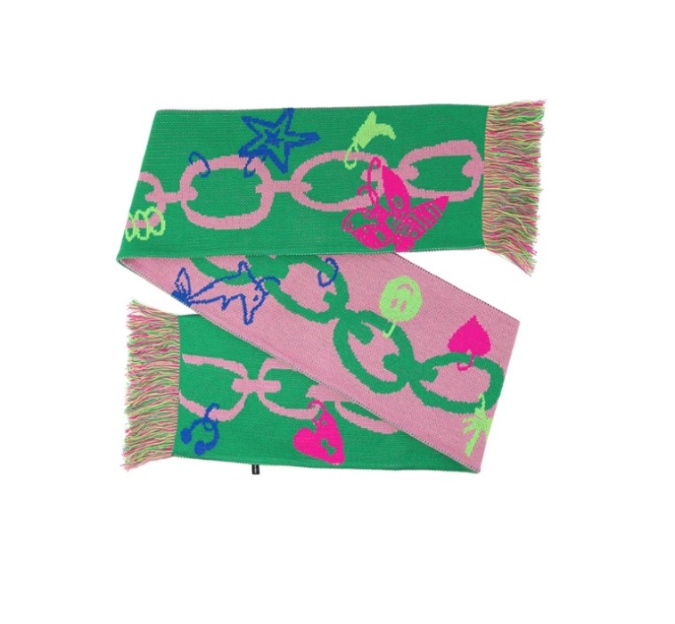 Une chaîne tricotée comme un collier fétiche, voilà l’intention forte de l’artiste Delphine Dénéréaz. Dessus pendent des breloques qui claquent, des port-bonheurs qui brillent – cœur/clef/dauphin transforment l’écharpe en bijoux.