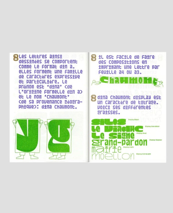 Spécimen Typographique du Studio Baldinger Vu-Huu, mise en page de leur caractère 'Dina' créé en 2023. Dina est un caractère conçu pour la nouvelle identité de la ville de Chaumont. Toute la famille de police est disponible gratuitement chez BVH Type.