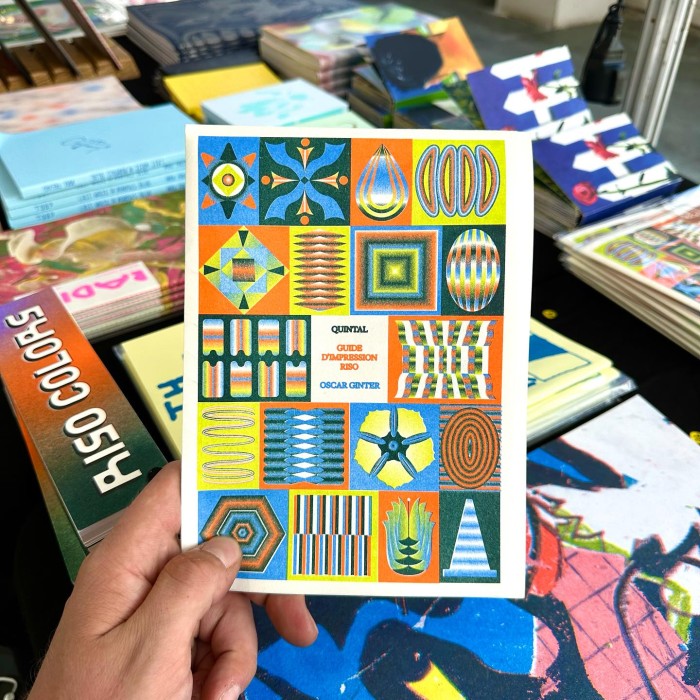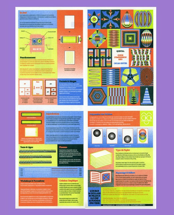 Un guide sur l’impression en risographie par Oscar Ginter. Deux feuilles A3 imprimées avec 67 passages de couleurs présentant les possibilités de la technique d’impression et de l’atelier Quintal.