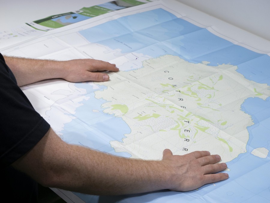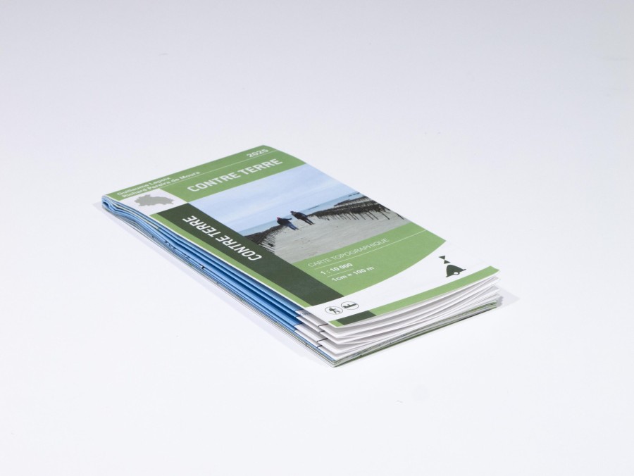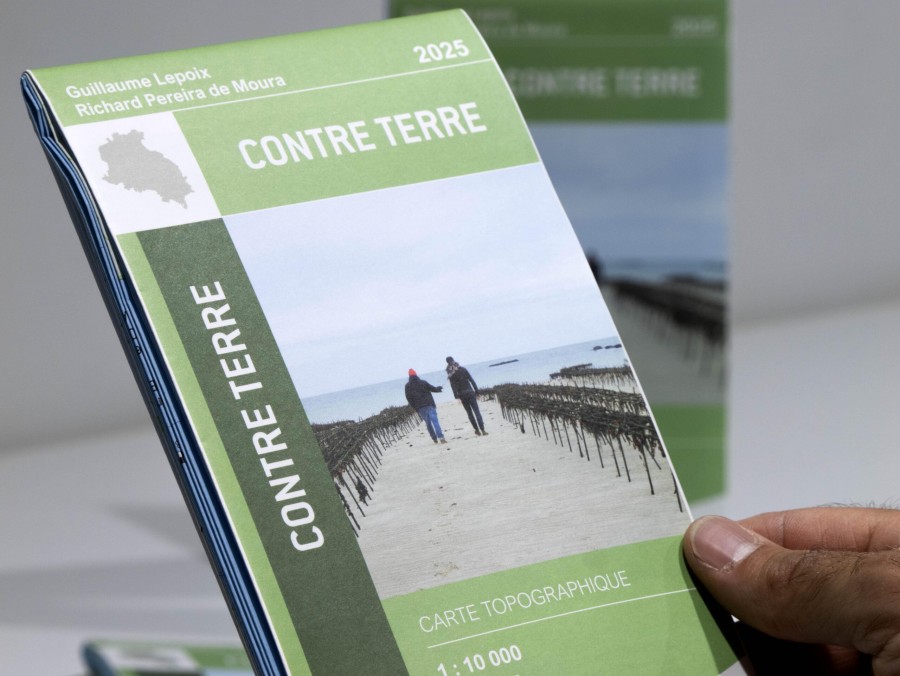 L’île de la Contre Terre est ici représentée sous la forme d’une carte topographique à l’échelle 1/10 000. Les tracés des espaces correspondent précisément à ceux de l’île des antipodes située dans le Pacifique Sud – inversée en symétrie à 180° lors de son passage de l’hémisphère sud à l’hémisphère nord. Toutes les données internes à la carte (toponymes, altimétrie et bathymétrie, biogéographie…) réfèrent quant à elles au contexte de sa localisation précise dans la Manche au large de la pointe de Barfleur.